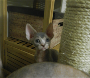 You might think that the lack of fur makes Sphynxes a low maintenance companion compared to their fur-covered counterparts -after all they don’t shed or require regular brushing out, and no need to worry about hairballs. In actuality, Sphynx cats require quite a lot of upkeep. They produce oils to protect their skin, and with no fur to absorb them, the oils rub off and stains materials that they come into contact with. Sphynxes therefore require periodic bathing. How often must you bathe them? That depends. Kelly recommends a bath once every 45 to 90 days. In the past she bathed her cats more frequently (some say it should be done as often as once a week) but found that the more often she bathed them, the more oils they’d produce. Striping the oils from the skin on a regular basis causes the body to overproduce them to compensate. Less frequent baths prevent the body from having to pump out excessive amounts of oil. Although most cats are not big fans of water, Sphynxes grow accustomed to baths and tolerate water well as long as they are introduced to baths at a young age. Kelly recommends bathing them in the bathtub or the kitchen sink using a gentle shampoo intended for animals -nothing human- and towel drying them afterwards. Sphynxes also require weekly ear cleaning (not surprising –look at those big ears!) and their feet need regular wipe downs as their nail beds tend to accumulate extra oils.