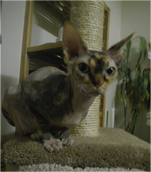 You might think that the lack of fur makes Sphynxes a low maintenance companion compared to their fur-covered counterparts -after all they don’t shed or require regular brushing out, and no need to worry about hairballs. In actuality, Sphynx cats require quite a lot of upkeep. They produce oils to protect their skin, and with no fur to absorb them, the oils rub off and stains materials that they come into contact with. Sphynxes therefore require periodic bathing. How often must you bathe them? That depends. Kelly recommends a bath once every 45 to 90 days. In the past she bathed her cats more frequently (some say it should be done as often as once a week) but found that the more often she bathed them, the more oils they’d produce. Striping the oils from the skin on a regular basis causes the body to overproduce them to compensate. Less frequent baths prevent the body from having to pump out excessive amounts of oil. Although most cats are not big fans of water, Sphynxes grow accustomed to baths and tolerate water well as long as they are introduced to baths at a young age. Kelly recommends bathing them in the bathtub or the kitchen sink using a gentle shampoo intended for animals -nothing human- and towel drying them afterwards. Sphynxes also require weekly ear cleaning (not surprising –look at those big ears!) and their feet need regular wipe downs as their nail beds tend to accumulate extra oils.